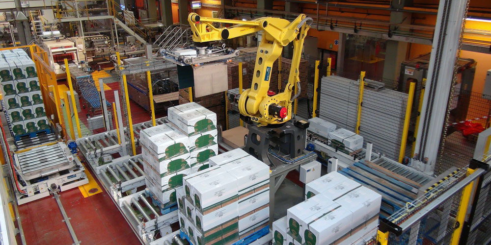 ZENON AUTOMATION SAICT, a member of the THEODOROU GROUP, automated the palletizing process at the food industry KYKNOS SA with a solution that includes robots for palletizing shrink-wrapped packages of metal containers and an automatic pallet wrapping system with stretch film. The system can handle four different sizes of metal containers and achieves a performance of up to 30 boxes per minute.